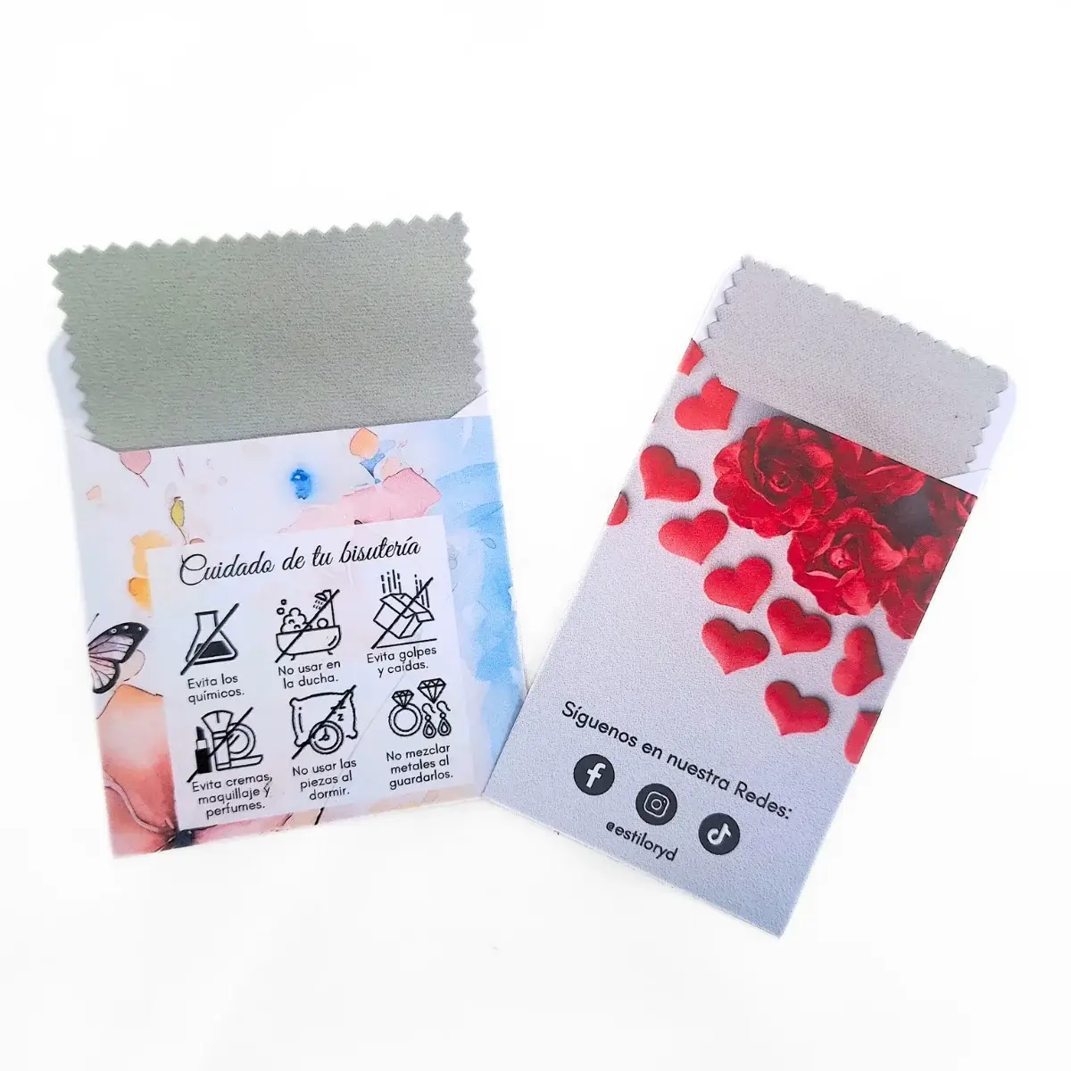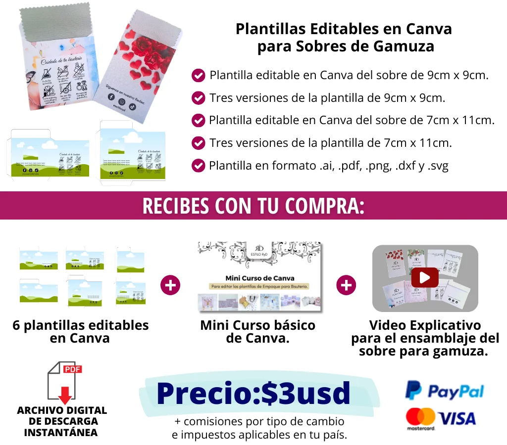 ✅ Plantilla editable en Canva de Sobre de tamaño 7cm x 11cm para gamuzas de 6.5cmx10cm en 3 versiones: Redes sociales, Guía de Cuidados y sin datos.