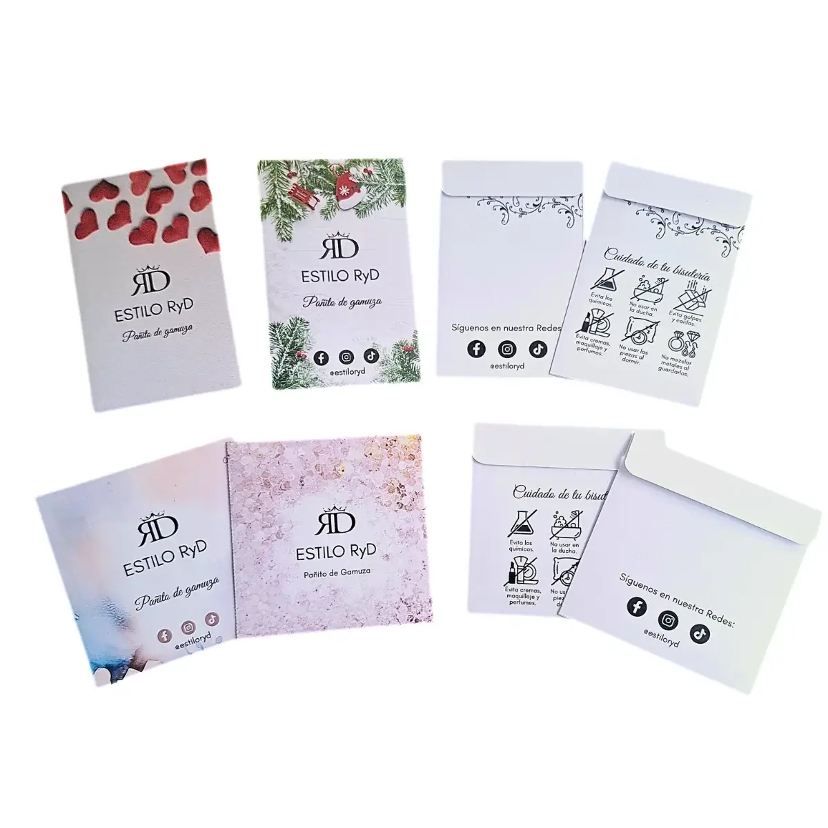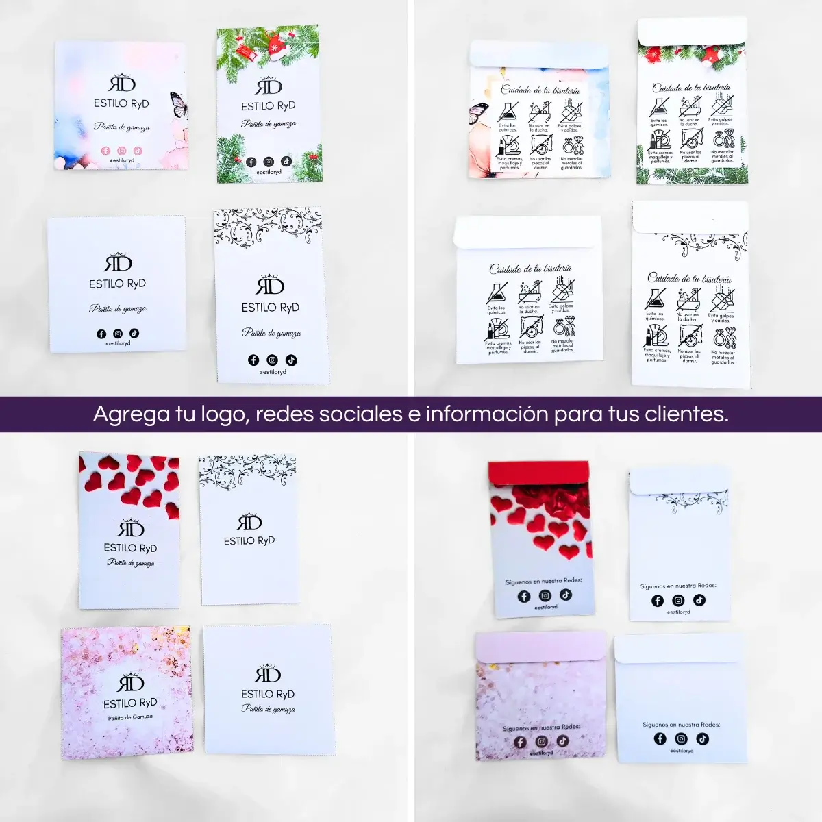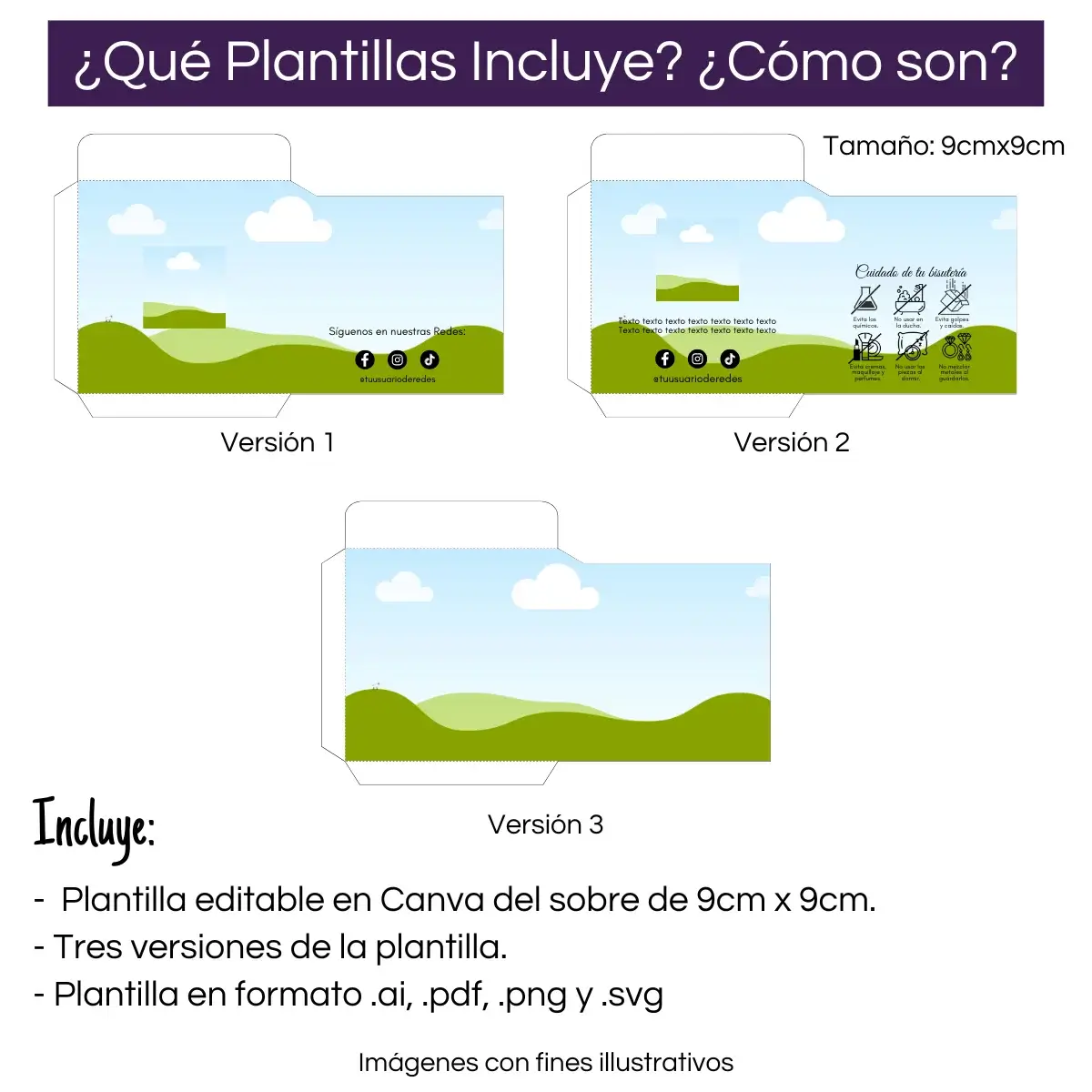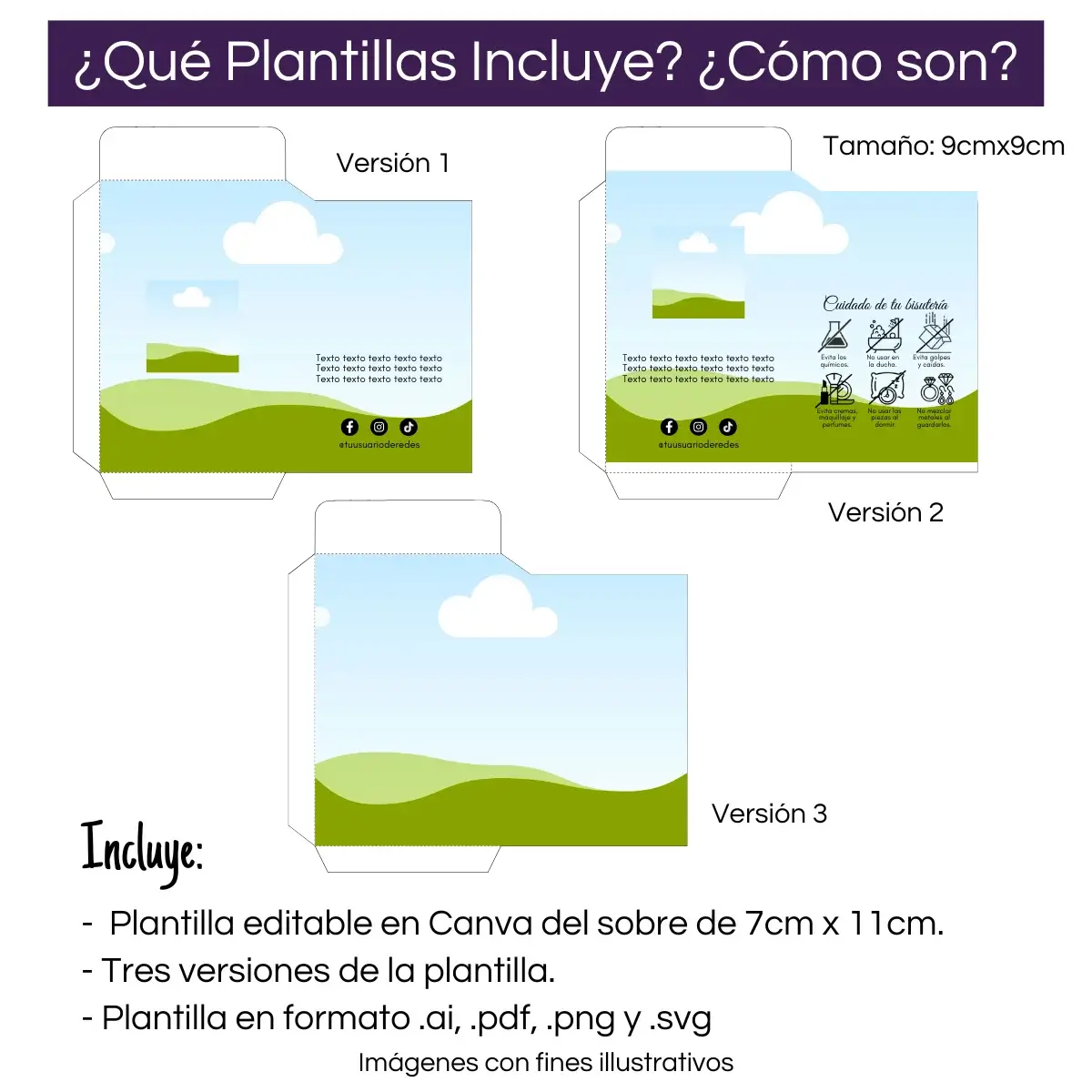 ✅ Plantilla editable en Canva de Sobre de tamaño 9cm x 9cm para gamuzas de 8cmx8cm en 3 versiones: Redes sociales, Guía de Cuidados y sin datos.