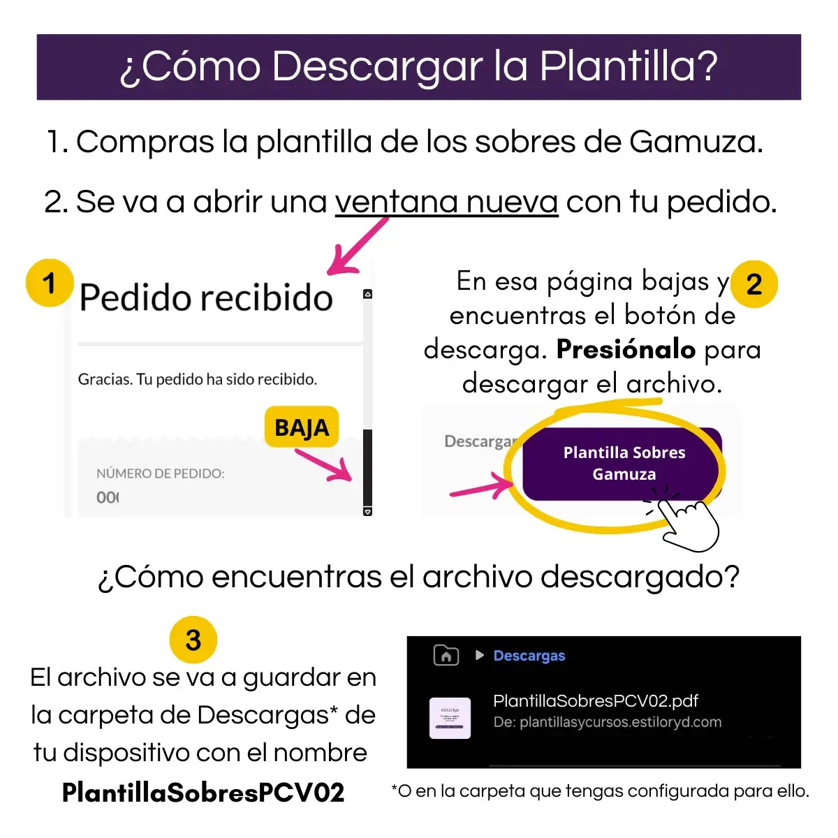 📌 Una vez procesado el pago, se abrirá una página con el Detalle de tu Pedido con el título Pedido Recibido. Ahí encontrarás un botón de Descarga. Presiónalo y se va a descargar en tu dispositivo un archivo .pdf llamado “PlantillaSobresPCV02“. Este archivo contiene los enlaces de acceso a la plantilla.